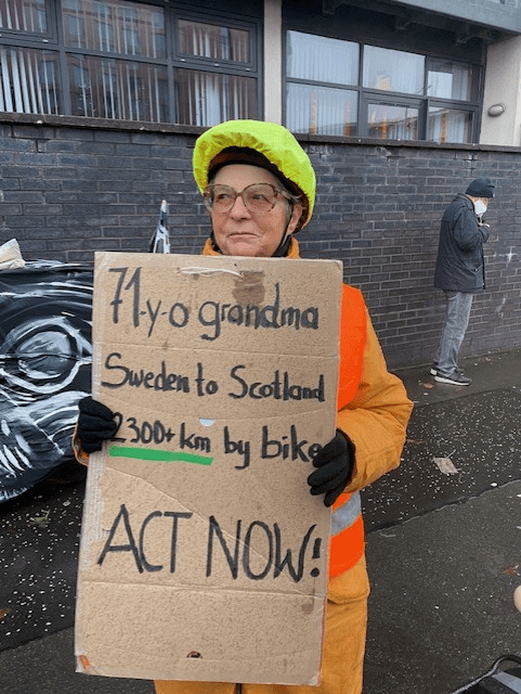 We came so close. A 71 year old granny who pedalled a pink bike for six weeks from Sweden to Glasgow to deliver a message on a cardboard sign in the rain.