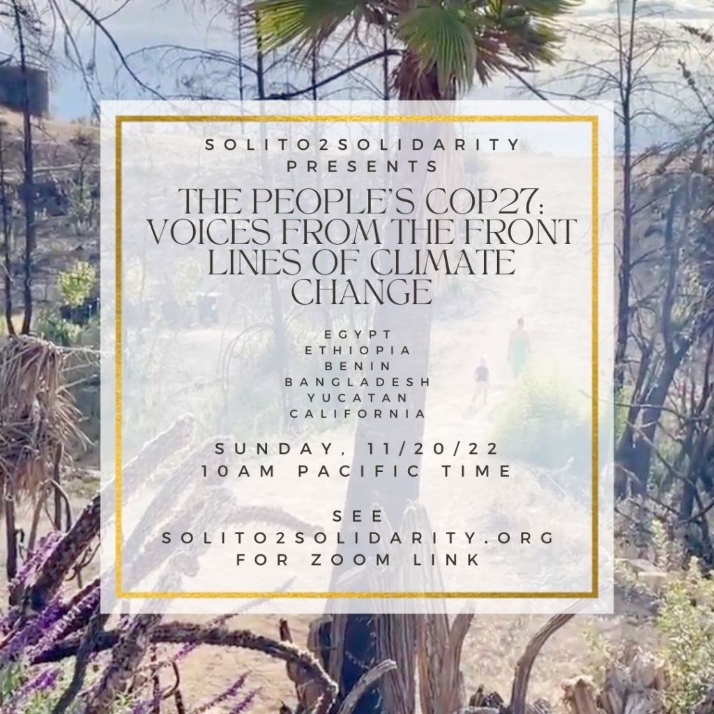 A year ago we joined together on Zoom for the People’s COP26 “Voices from the Front Lines of Climate Change.” Across ten time zones, we asked how did you experience nature as children? What has changed in the environment? How has climate change informed you work as activists and defenders of the earth? Many things have happened since last November — floods in South Asia; wars in Ukraine & Tigray; food shortages; fossil fuel energy spikes. But we resist “doom and gloom” despair and passivity in favor of concrete examples of resilience, adaptation and positive climate action. We believe in the transformative energy of sharing stories of courage, adaptation, resilience. Our theme is From Solito (aloneness, isolation, fear) to Solidarity (joining together to survive, adapt and thrive.)